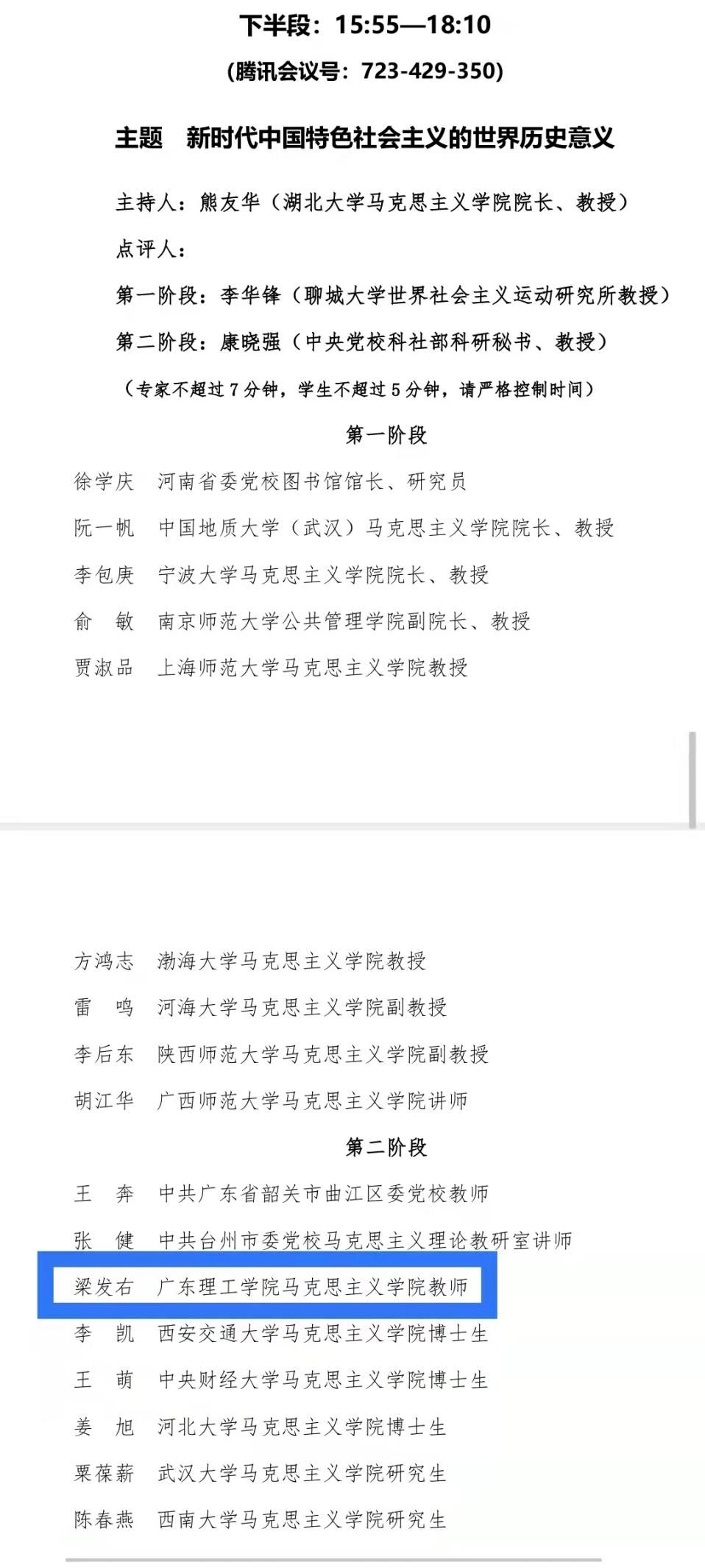 本网讯(永利yl23411) 2022年11月5日,“深入学习贯彻党的二十大精神”学术研讨会暨中国科学社会主义学会2022年年会分别在中央党校(主会场)和华中师范大学(分会场)隆重召开,永利yl23411梁发右老师受邀参会并以线上形式在华中师范大学(分会场)作主题发言。梁发右老师作了“中国式现代化的伦理意蕴”的主题发言,获得了与会专家的肯定与赞扬。本次参会充分展示了永利yl23411教师良好的科研素养和精神风貌,是永利yl23411教师学习贯彻党的二十大精神的具体体现,对于进一步提升我校的学术影响力具有积极意义。