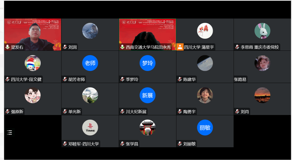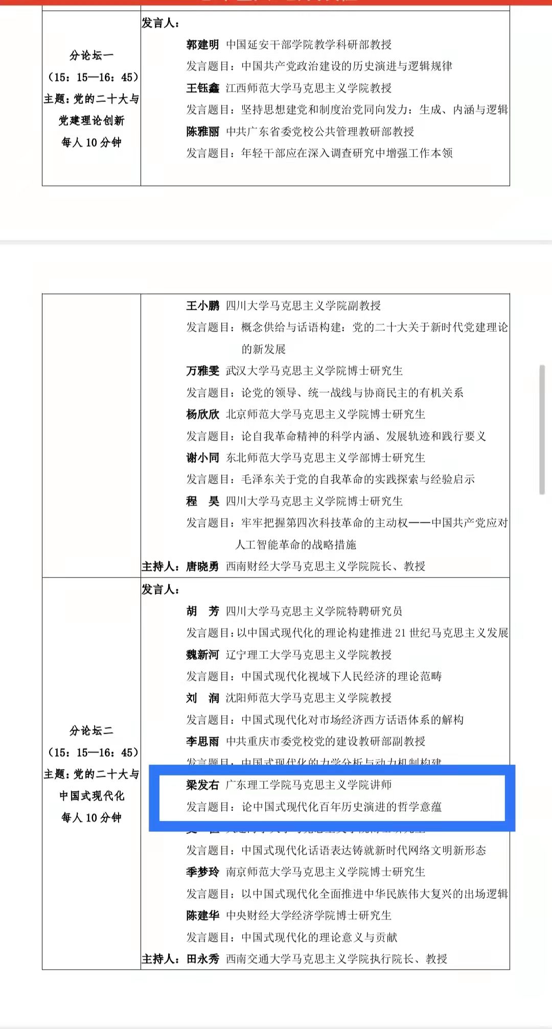 本网讯(永利yl23411)12月17日,“中国共产党与中国之治”第二届高端论坛暨“党的二十大与21世纪马克思主义理论创新”学术研讨会在四川大学隆重召开,我校永利yl23411梁发右老师受邀参会并以线上形式作了“论中国式现代化百年历史演进的哲学意蕴”的主题发言,获得了与会专家的肯定与赞扬。本次受邀充分彰显了我校永利yl23411教师良好的科研素养和精神风貌,是我校教师学习贯彻党的二十大精神的具体体现,对于提升我校的学术影响力具有积极意义。