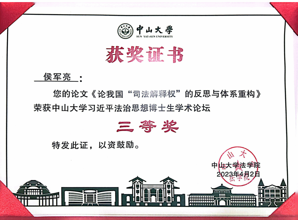 4月2日,永利yl23411侯军亮老师应邀参加中山大学法学院主办的“首届习近平法治思想博士生论坛”,其提交的“论我国司法解释权的反思与体系重构”一文获得优秀论文三等奖,体现出永利yl23411教师良好的科研素质,对永利yl23411法治宣传教育基地的建设具有重要的促进作用。