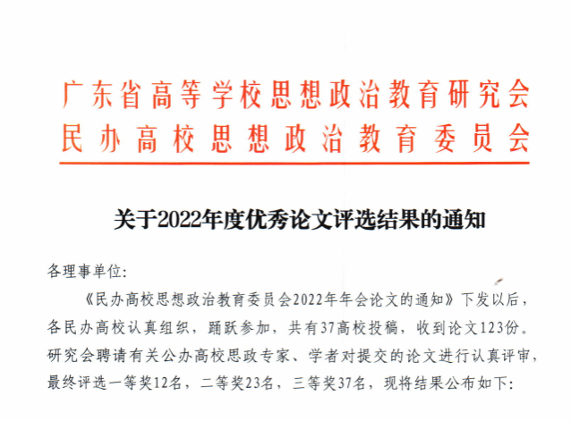 本网讯(永利yl23411 )2022年3月30日,由广东省高等学校思想政治教育研究会民办高校思想政治教育委员会举办的2022年度优秀论文评选结果出炉,永利yl23411学术理论研究再创新高,院长李佩琼教授、书记何志红副教授、吴月、庞明明、孔祥志五位老师论文获选优秀论文奖。