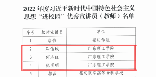 近日,肇庆市2022年度习近平新时代中国特色社会主义思想“进校园”先进集体、优秀宣讲员、先进工作者评选结果揭晓,经学校申报推荐、综合考评、集中公示和市委教育工委研究决定,永利yl23411获评“先进集体”,教师何志红、庞明明、邓佳城获评“优秀宣讲员”。