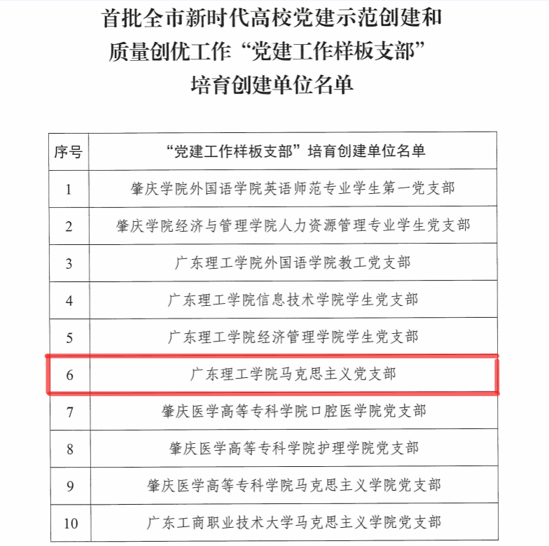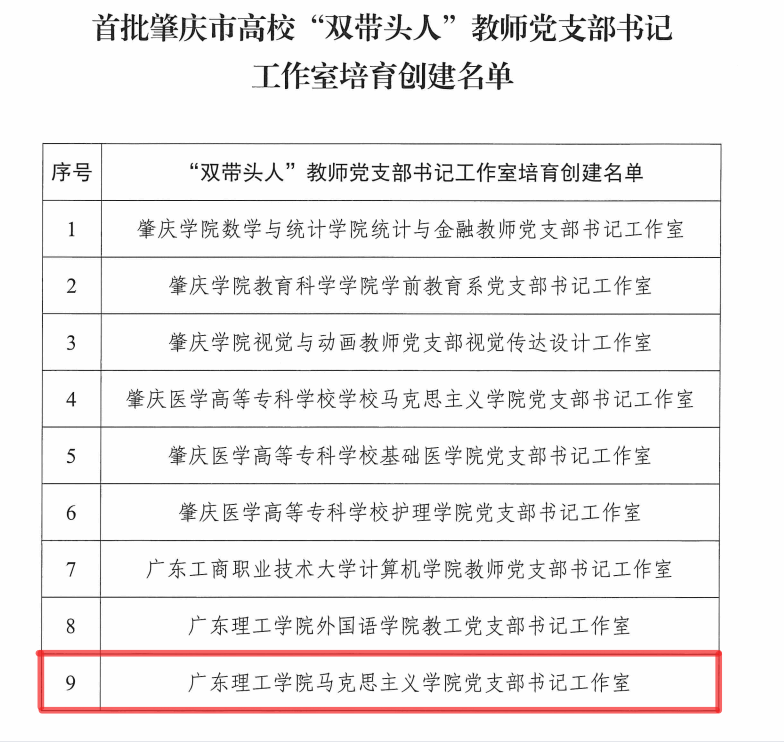 近日,中共肇庆市委教育工委公布了新时代高校党建示范创建和质量创优工作和首批肇庆市高校“双带头人”教师党支部书记工作室培育创建名单。广东理工学院共有5个支部上榜,其中永利yl23411党支部荣登首批肇庆市高校“党建工作样板支部”和“‘双带头人’教师党支部书记工作室”培育创建单位。