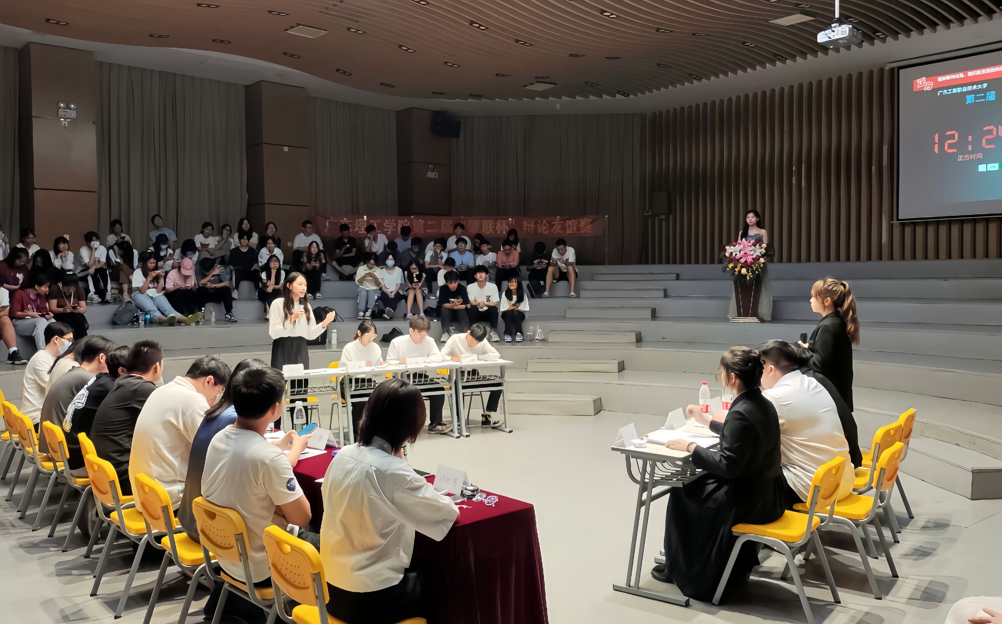 随后是由广东工商职业技术大学辩论队与广州应用科技学院辩论队围绕“面对精神内耗我们更需要接纳/鞭策自己”这一辩题展开激烈辩论。现场火药味十足,双方辩友沉着应对来自对方的“明枪暗箭”,用清晰、缜密的逻辑推理掀起来一个个辩论高峰。感谢双方的精彩辩论给观众带来不一样的比赛盛宴。