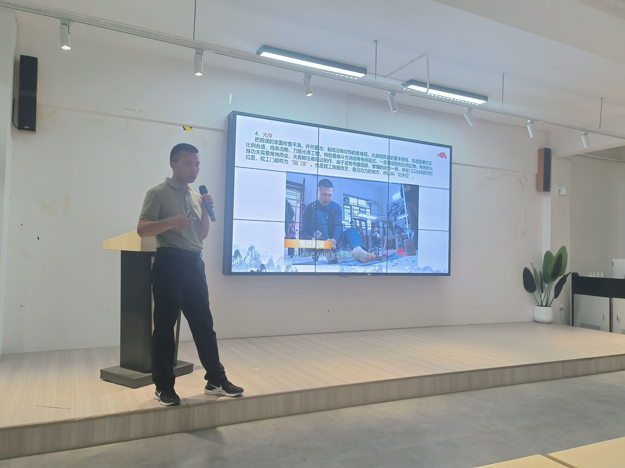 讲座特别邀请了程振良大师主讲,作为资深的端砚研究专家、中国制砚艺术大师、高级工艺美术师和“大国工匠”荣誉称号获得者,程大师在端砚领域深耕多年,有着丰富的实践经验和深厚的理论造诣。讲座伊始,程大师以生动的语言和丰富的图片资料,深入浅出地介绍了端砚的历史渊源。通过详实的历史故事和文物记载,让大家仿佛穿越时空,见证了端砚在岁月长河中的演变。在讲解端砚的制作工艺时,程大师更是结合自身多年的创作经验,详细剖析了开采原石、选料、设计、雕刻、打磨等每一道工序的要点和难点。他指出,端砚制作不仅需要精湛的技艺,更需要制砚人对石材的独特理解和感悟,才能将一块普通的石头雕琢成精美的艺术品。